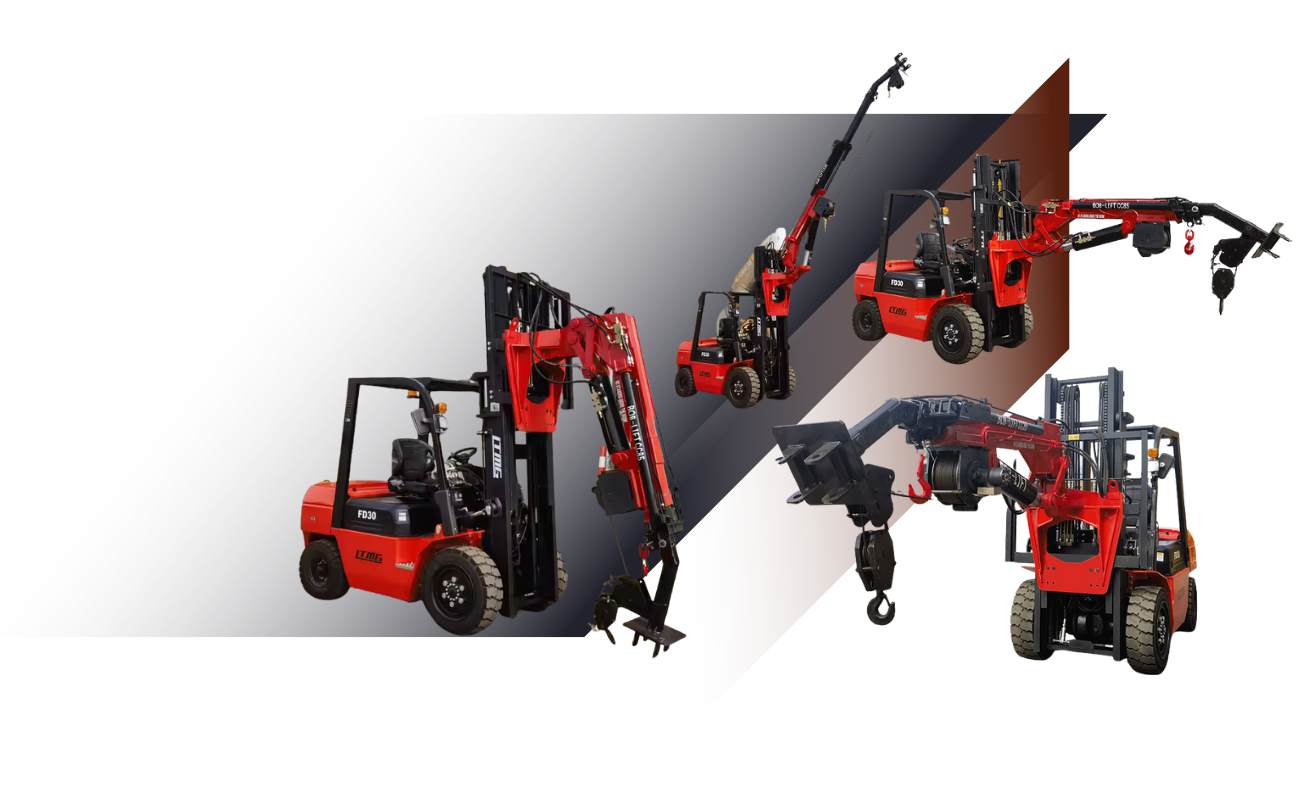 Equipamento tripla função capaz de performar içamentos com guincho, acoplar cesto para acesso em altura e içamentos com garfo duplo.